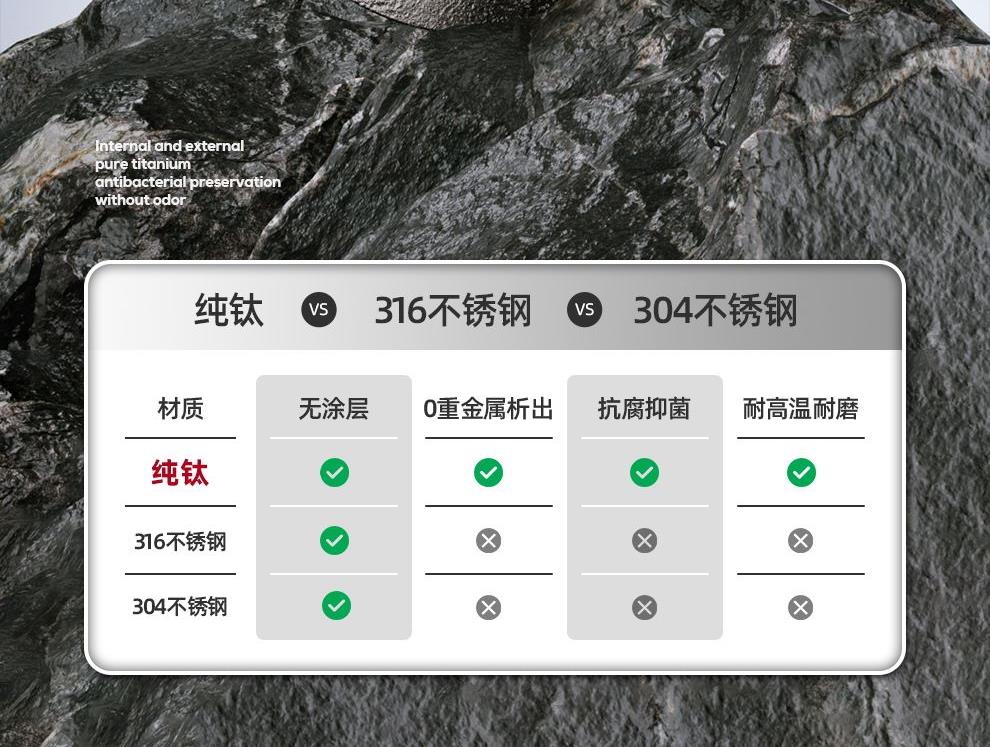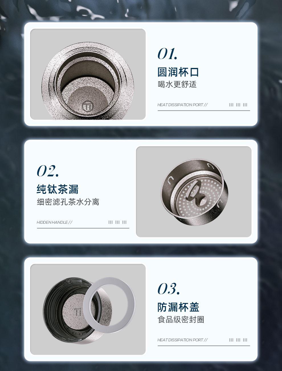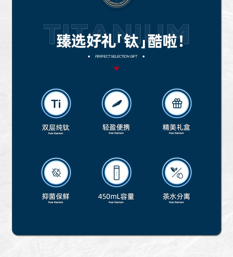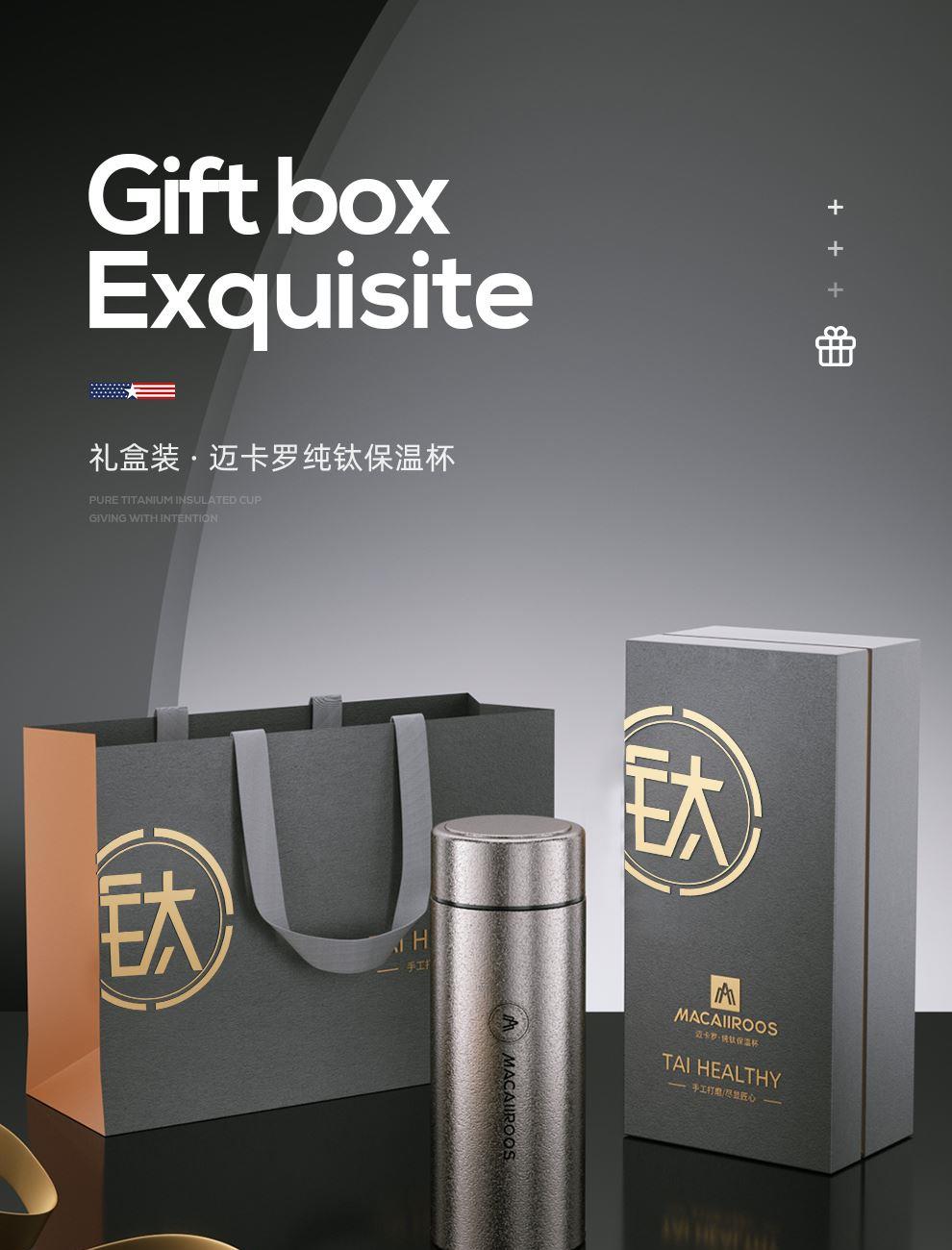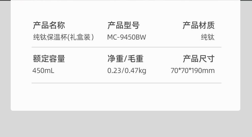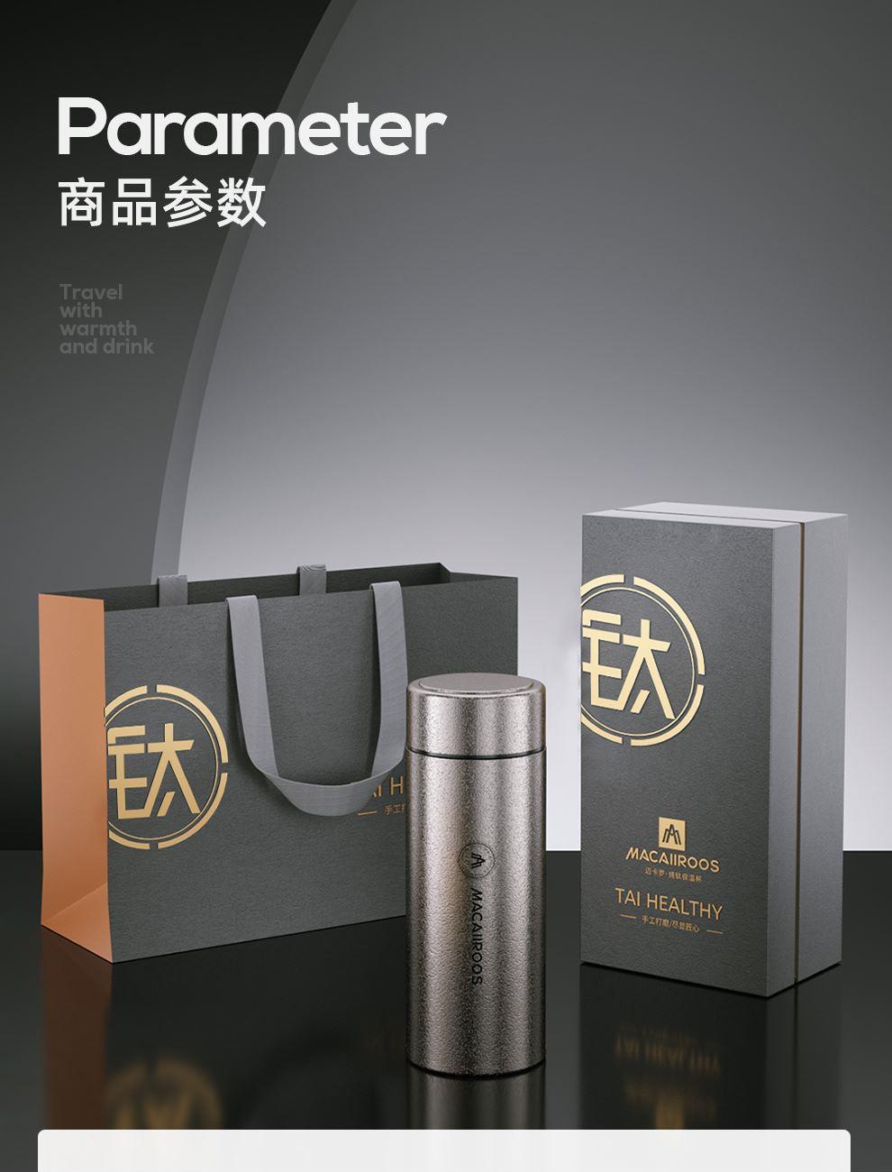 規(guī) 格:480ml 材 質(zhì):鈦 產(chǎn)品凈重:0.19kg 產(chǎn)品毛重:0.43kg 整箱重量:9.8kg 純鈦材質(zhì)雙層純鈦杯體,更輕便更安全,0重金屬無(wú)異味0擔(dān)憂; 真空保溫雙層真空杯體,冷熱兩用,高效鎖溫,保鮮; 輕量隨行&360°密封防漏190g輕量杯身,防漏杯蓋密封性好,戶外使用攜帶輕便; 贈(zèng)禮佳品禮盒裝,適合禮贈(zèng)“鈦”有面子。