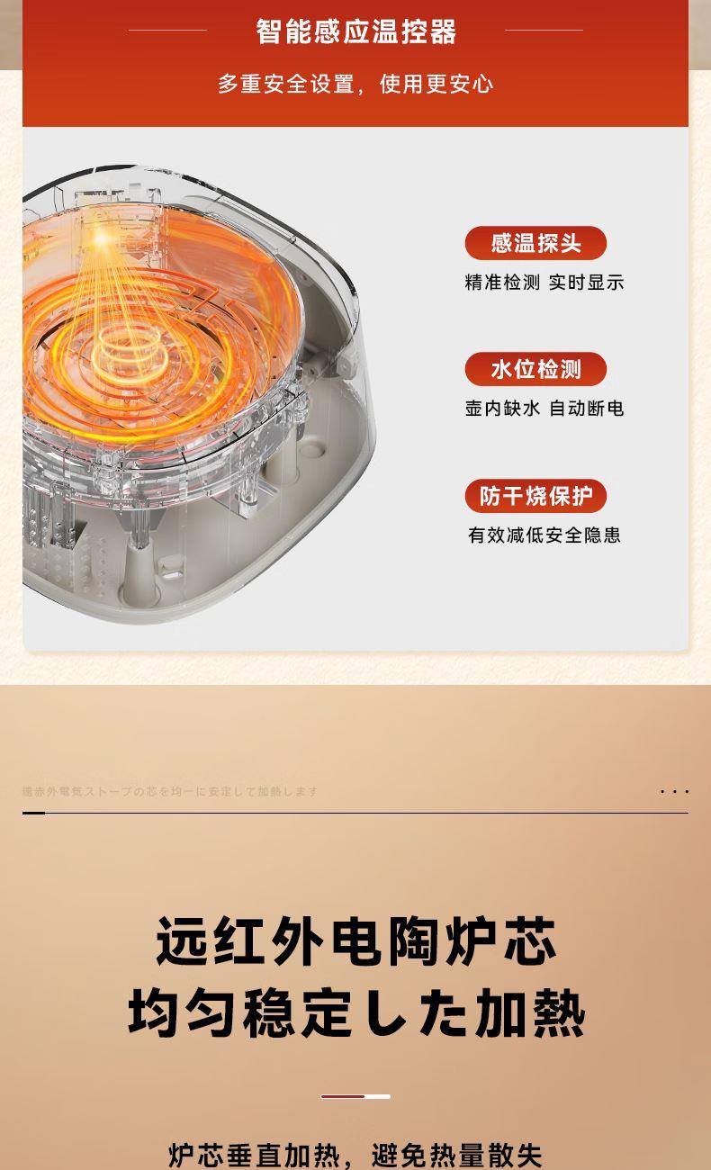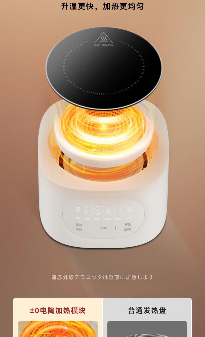 容量1L 額定電壓220V 額定功率900W 全玻璃一體 可拆上蓋 發(fā)熱盤涂層材質(zhì) 0涂層 12小時長效預(yù)約,24小時自動保溫 5大花樣菜單,養(yǎng)生需求全滿足 遠紅外電陶爐芯,升溫更快,加熱更均勻 加厚高硼硅玻璃,無磨底,無懼驟冷驟熱