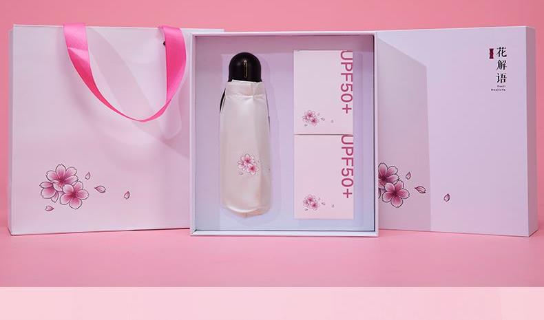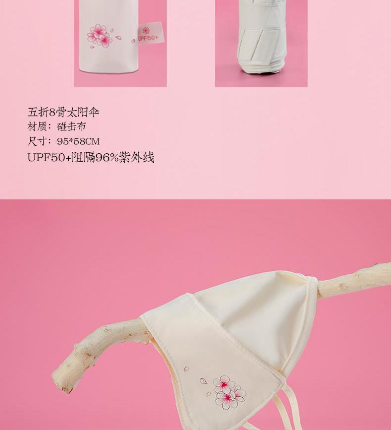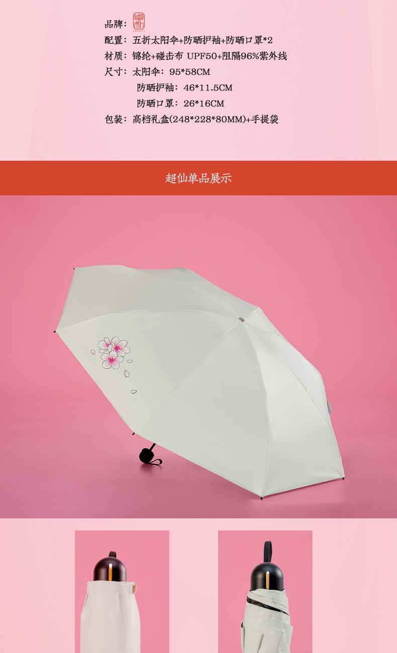 配置:五折太陽傘+防曬護(hù)袖+防曬口罩*2 材質(zhì):錦綸+碰擊布 UPF50+阻隔96%紫外線 尺寸:太陽傘:95*58cm 防曬護(hù)袖:46*11.5cm 防曬口罩:26*16cm 包裝:禮盒(248*228*80mm)+手提袋