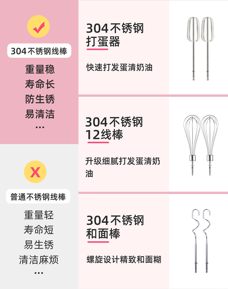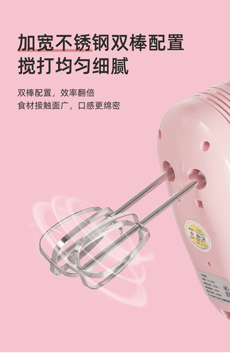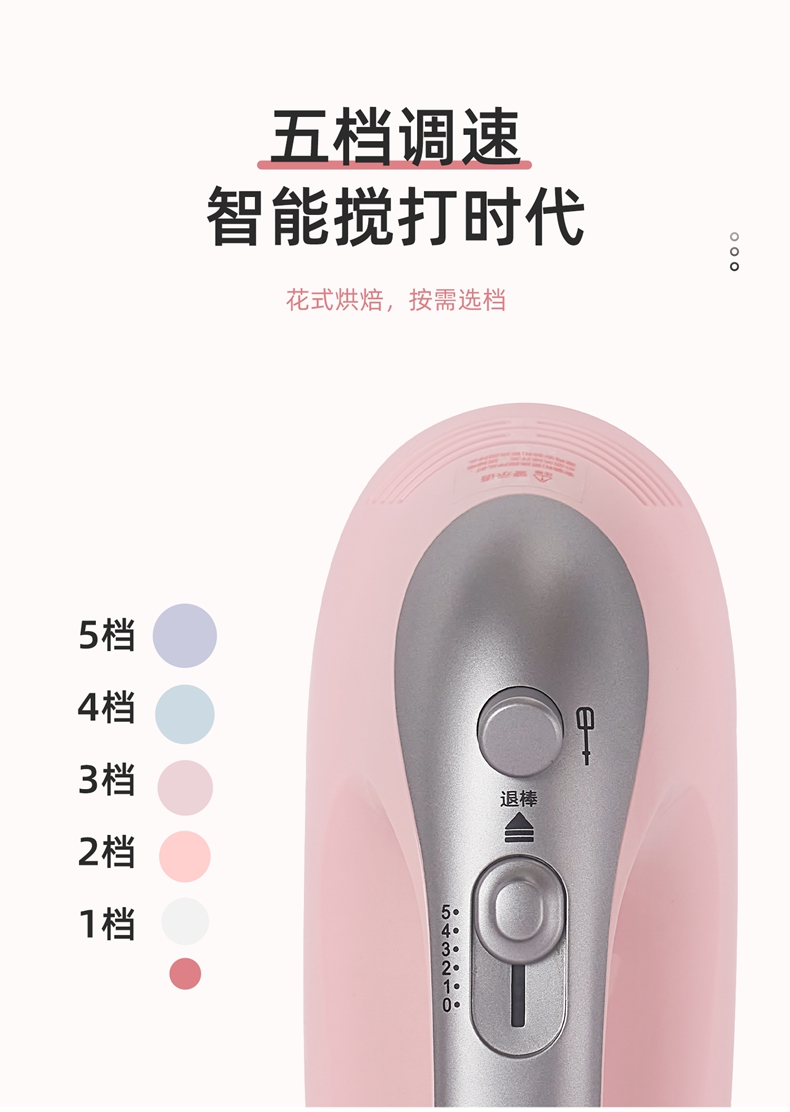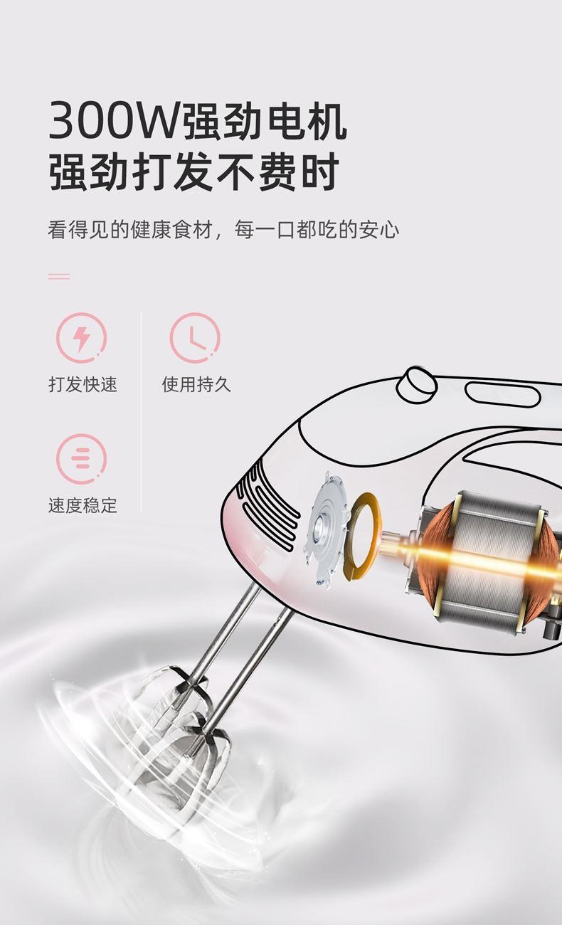 300w大功率電機(jī),打發(fā)更快更細(xì)膩,攪打強(qiáng)勁高效,304攪拌棒; 5檔自由調(diào)速,滿足不同打發(fā)需求 ; 一鍵快速退棒,操作方便 不臟手; 不同食材需求 高效打發(fā)攪拌;