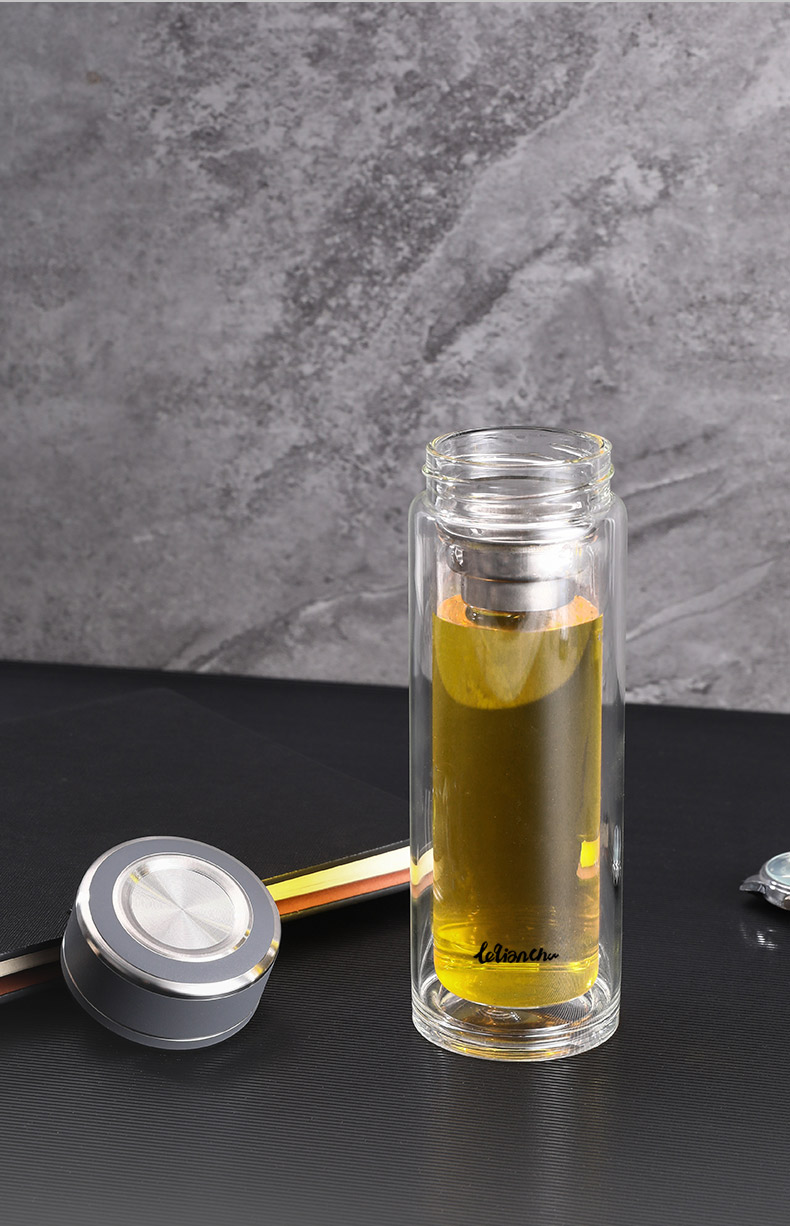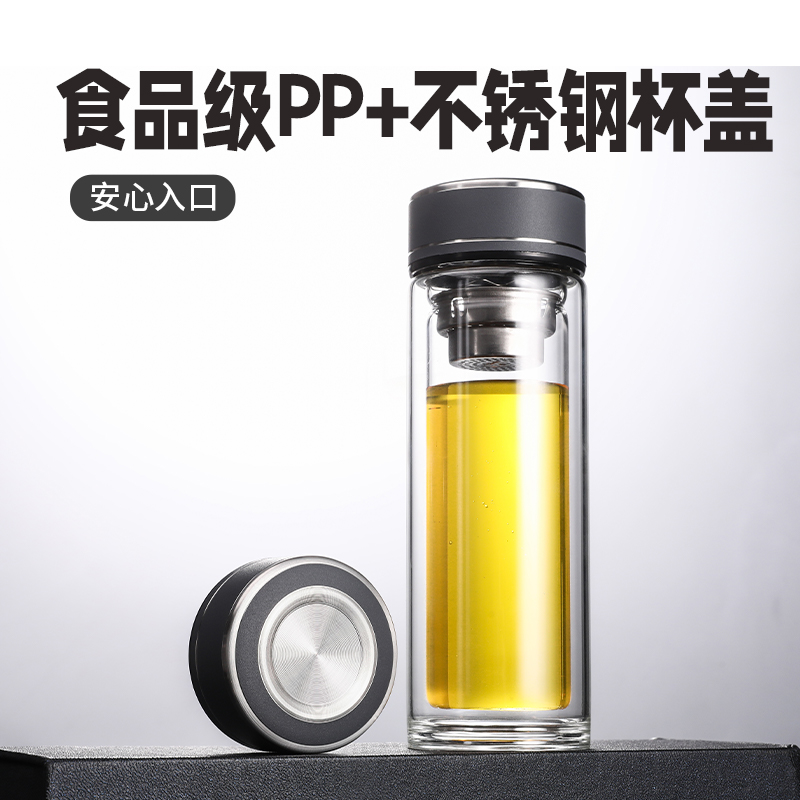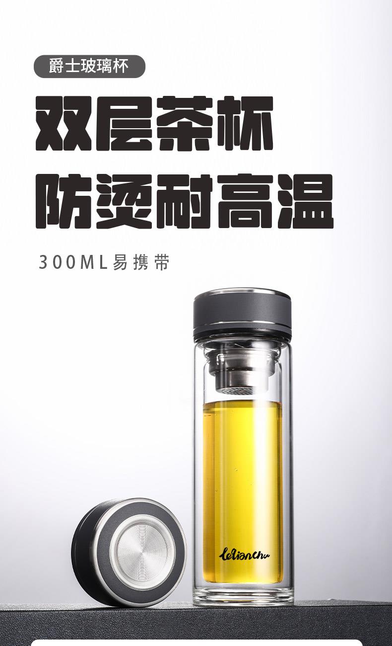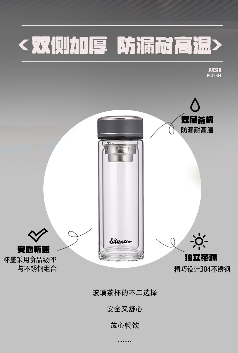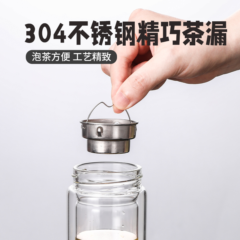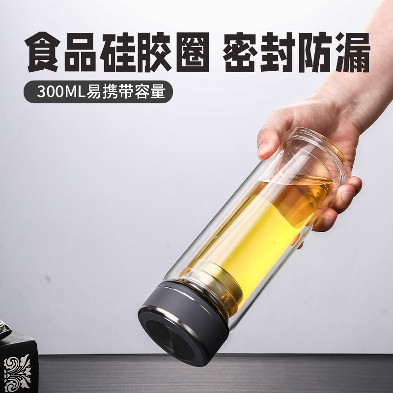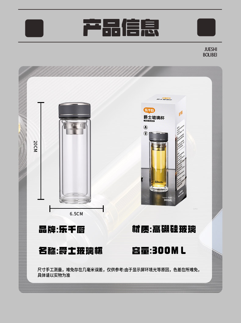 材 質(zhì):高硼硅玻璃 容 量:300ml 彩盒尺寸:6.9*6.9*20.5cm 1. 杯身采用雙層高硼硅玻璃,有效隔熱防燙; 2. 304不銹鋼茶漏,有效阻隔茶渣入口; 3. 杯蓋密封性良好無滴漏; 4. 杯口圓潤光滑,觸感溫潤舒適; 5. 底座堅固耐磨,有效保護杯體。