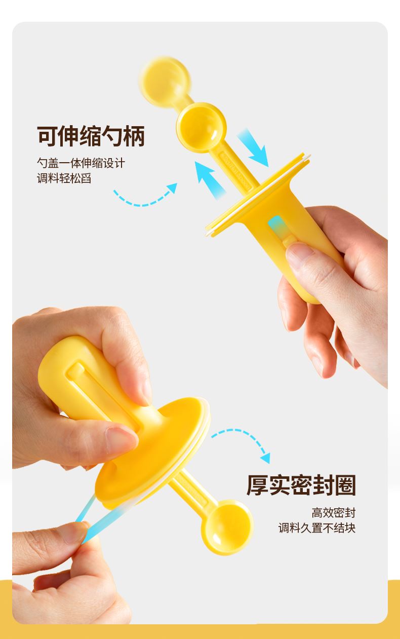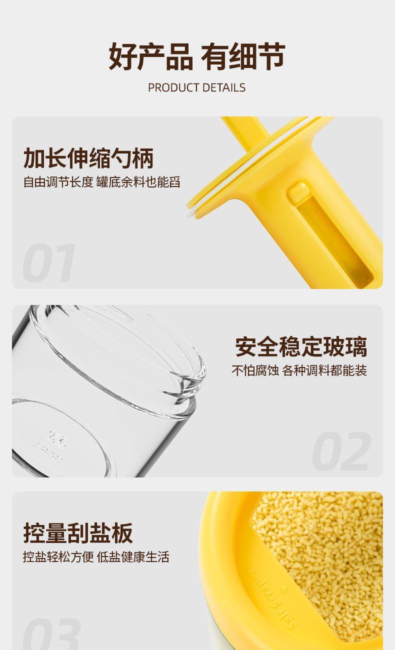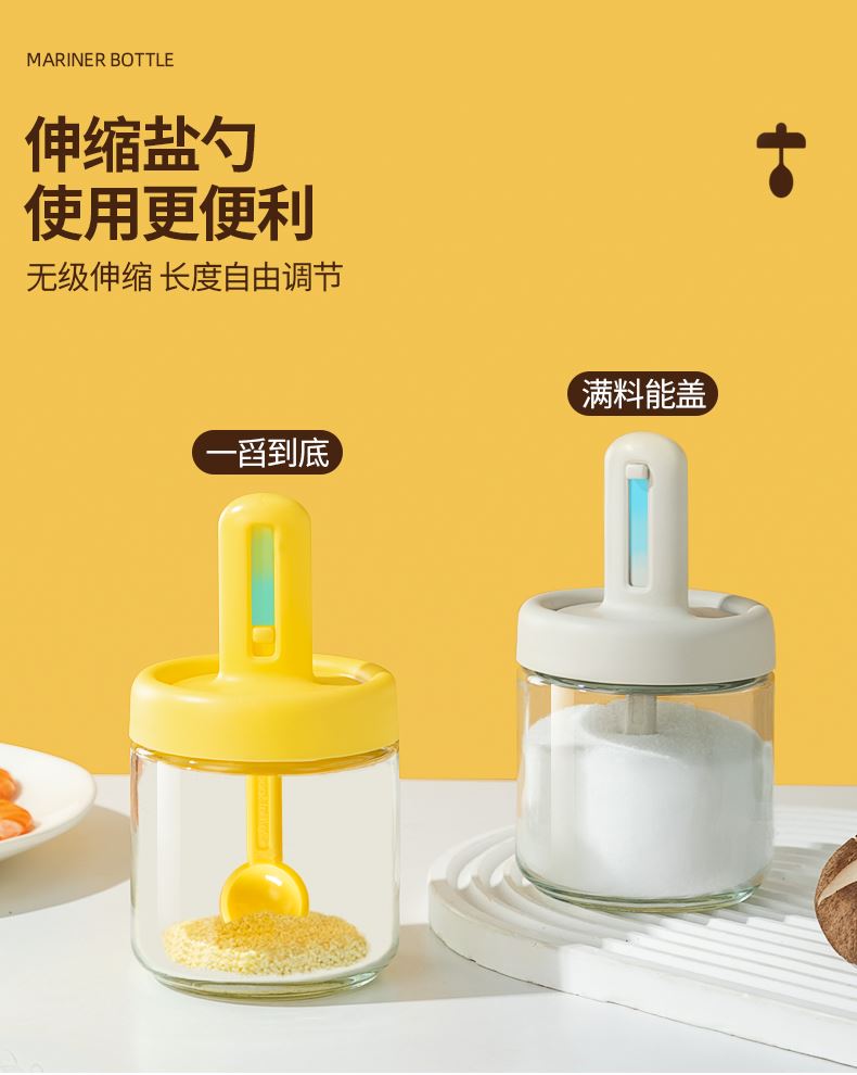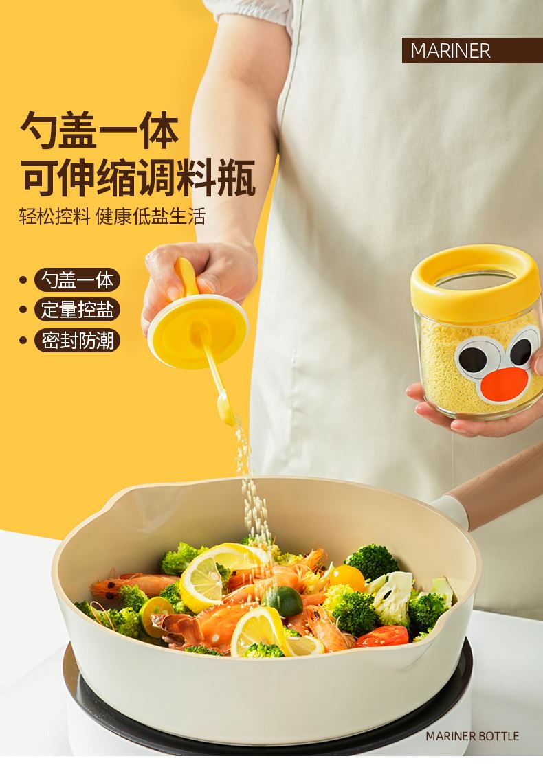 勺蓋一體可伸縮調(diào)料瓶 輕松控料 健康低鹽生活 可伸縮勺柄,勺蓋一體伸縮設(shè)計(jì)調(diào)料輕松舀 伸縮鹽勺使用更便利,無級(jí)伸縮 長度自由調(diào)節(jié) 自帶刮鹽板定量控鹽好幫手 靈活勺柄滿料也能輕松蓋,滿料插入勺柄自動(dòng)回縮 安全穩(wěn)定玻璃不怕腐蝕 各種調(diào)料都能裝