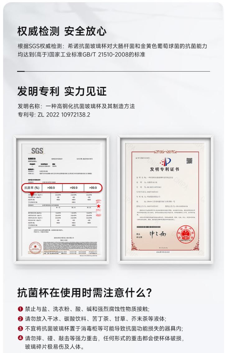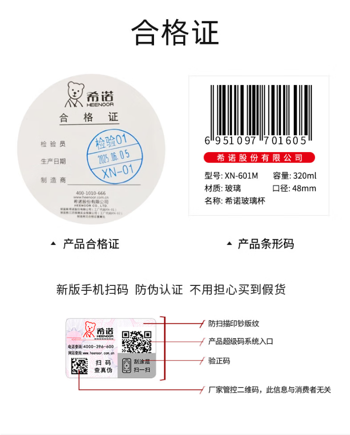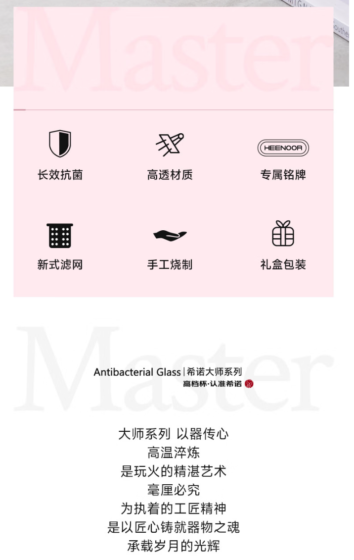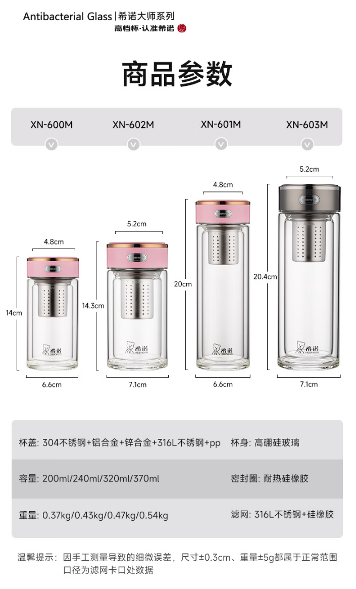 容量 XN-600M: 200ml 規(guī)格(mm) XN-600M:48(杯口直徑) x66(直徑) x140(高度) 杯體 鉑金級(jí)高硼硅玻璃、銀離子 濾網(wǎng) SUS316L、食品級(jí)硅膠 密封圈 食品級(jí)硅膠 條形碼 XN-600M: 6951097701599