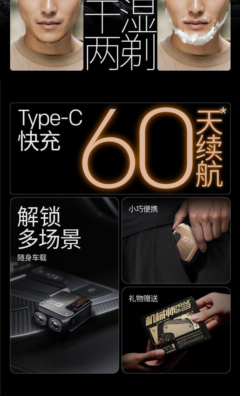 1、無線耳機(jī)盒大小,設(shè)計精致小巧,超高顏值; 2、18道精工電鍍,夠亮夠潮; 3、6000轉(zhuǎn)高速靜噪電機(jī),夠性能才夠快; 4、15片馬氏精鋼刀, 弧面刀網(wǎng),順滑貼膚,干濕兩剃; 5、IPX7級防水等級,可全身水洗;